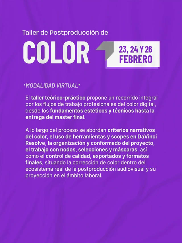 El cronograma comenzará el 23 de febrero con charlas sobre el proceso creativo desde el color y el sonido. Los talleres prácticos de postproducción en color se desarrollarán los días 24 y 26 de febrero, mientras que los de postproducción de sonido tendrán lugar el 25 y 27 de febrero, todos en modalidad virtual.